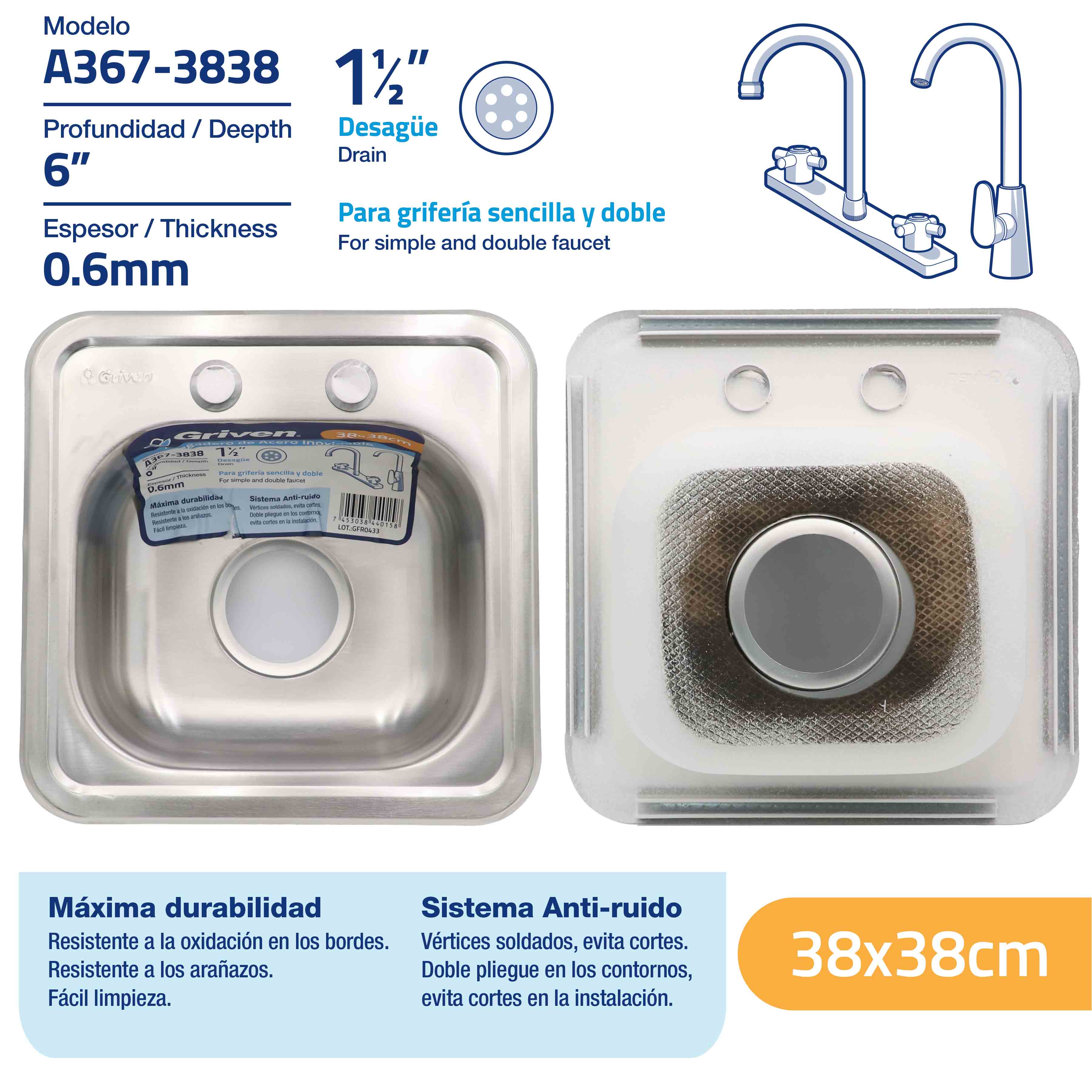 - Griven 38cm x 38cm Stainless Steel Kitchen Sink [A367-3838]